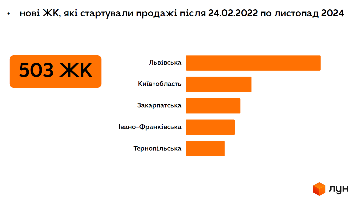 Загалом з початку війни будівельники запустили понад 500 нових проєктів. Безумовним лідером запуску проєктів є Львівська ообласть (150 ЖК), яка почала будівництво у вдвічі більше проєктах, ніж столичному регіоні (70).
