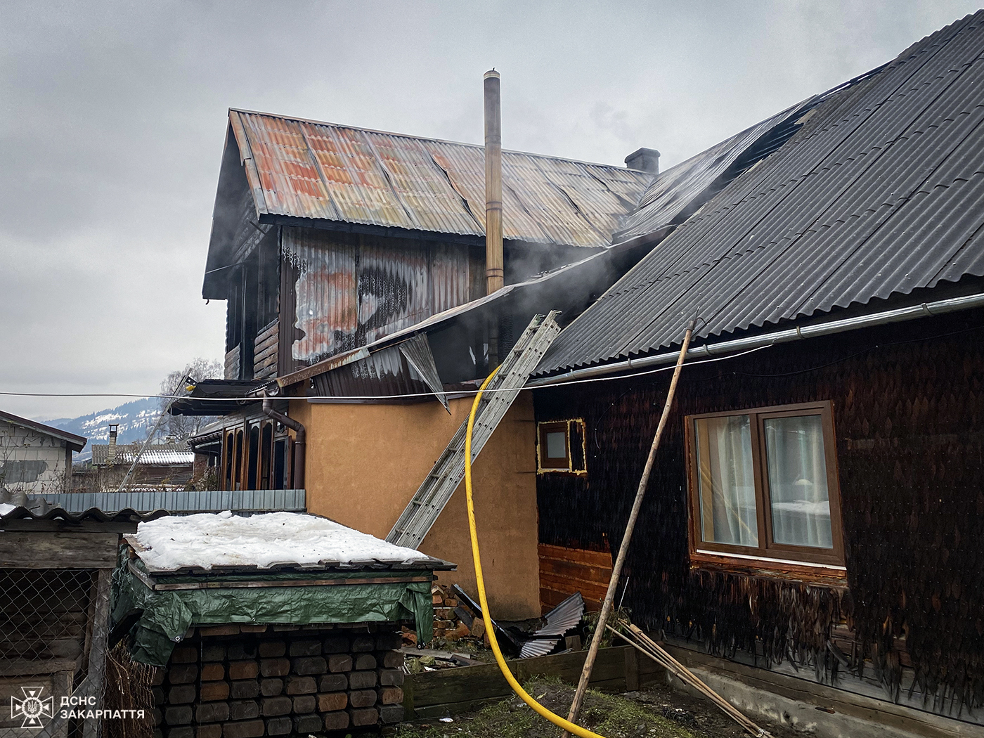За викликом на місце події прибули бійці державних пожежно-рятувальних підрозділів м. Рахів і смт Ясіня – усього було залучено 3 одиниці техніки. О 09:48 рятувальникам вдалося локалізувати загорання й зупинити поширення вогню, а об 11:34 – повністю ліквідувати пожежу на площі 200 кв.м. Полум’я знищило покрівлі й речі домашнього вжитку на горищах обох помешкань.