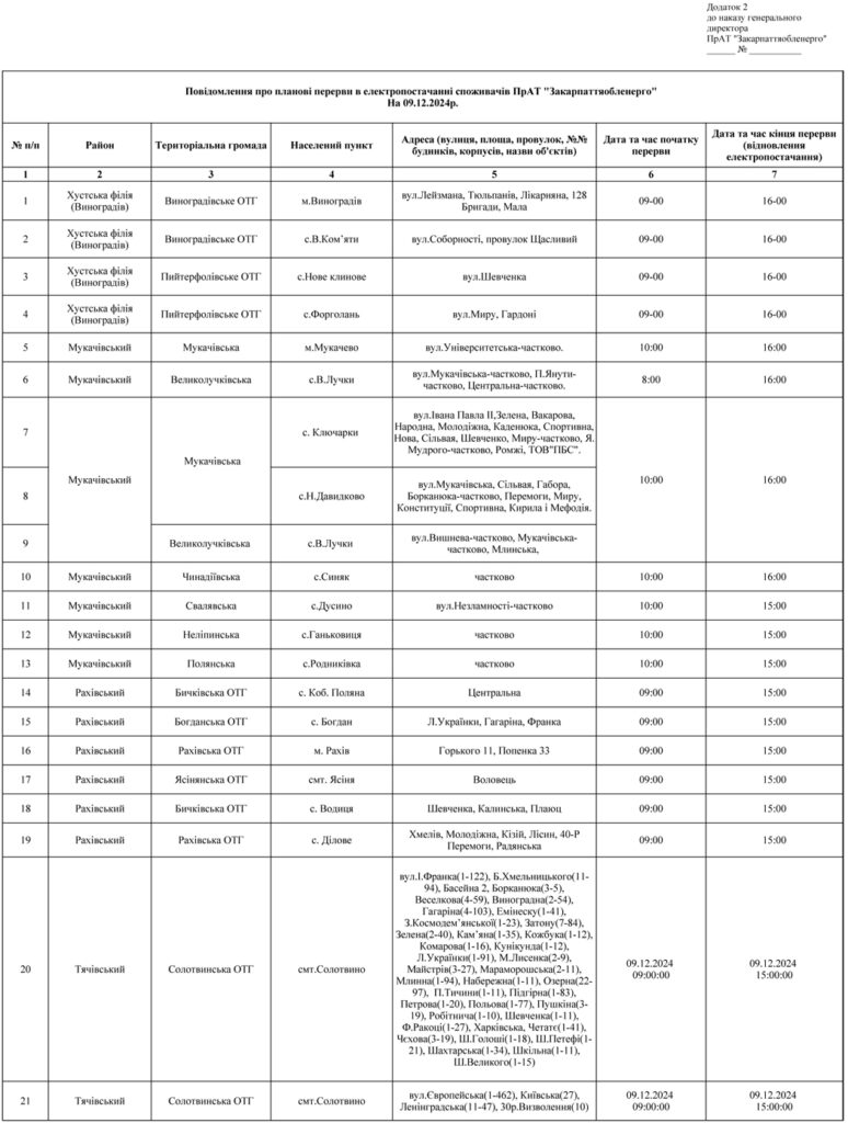 До уваги споживачів графік погодинних включень/відключень електроенергії на понеділок, 09.12.2024.
