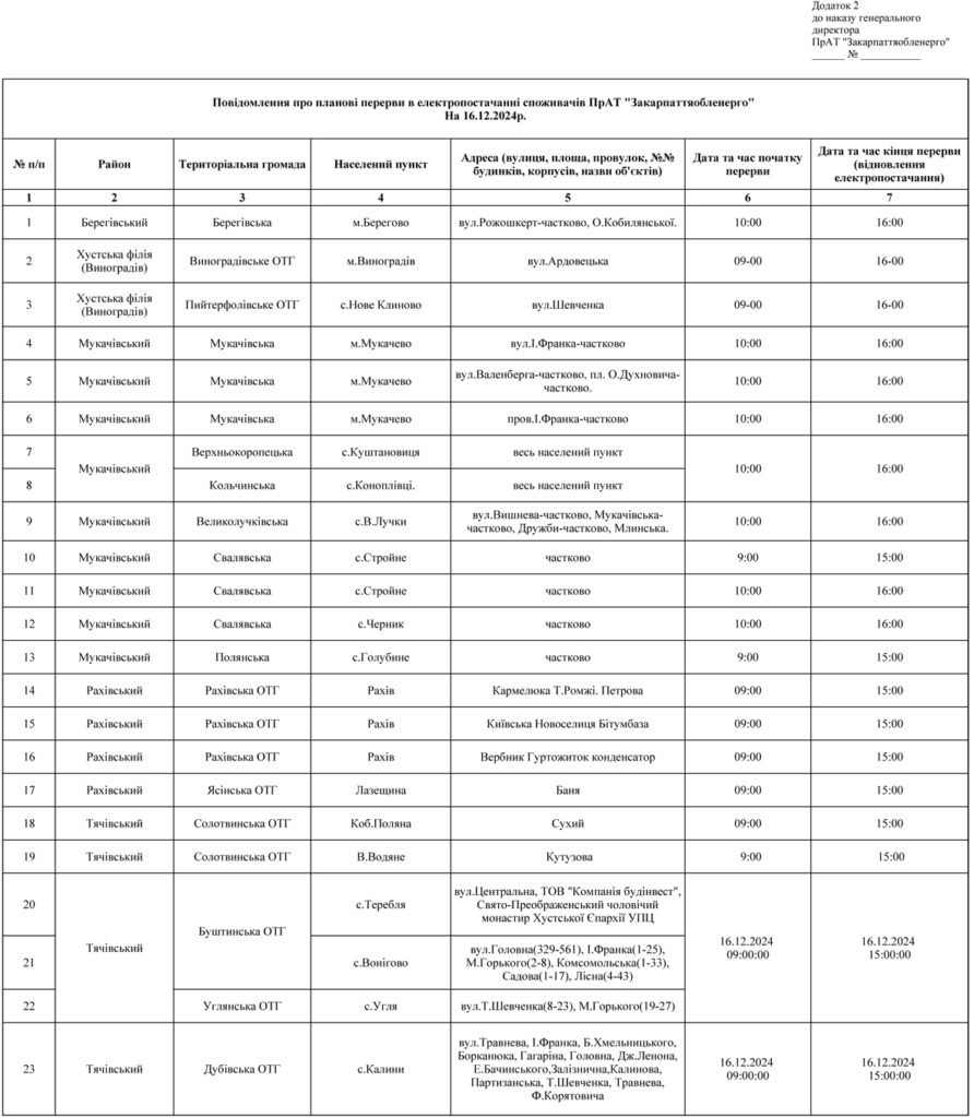 Завтра, 16 грудня, на Закарпатті протягом доби мешканцям області, залежно від групи, електроенергію вимикатимуть як погодинно так і проводитимуться планові відключення, згідно графіку.