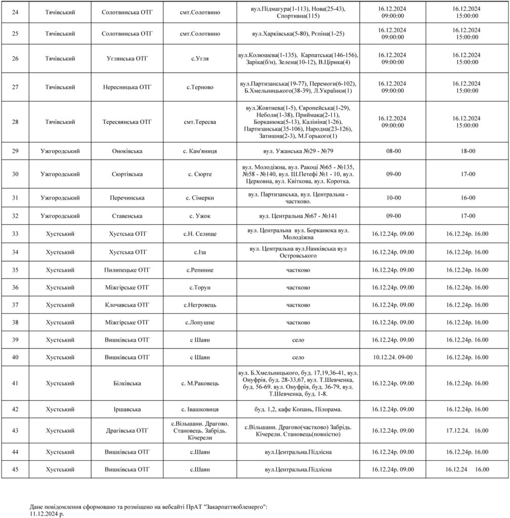 16 грудня, застосування ПЛАНОВИХ обмежень електрики по області будуть у 45 населених пунктах: