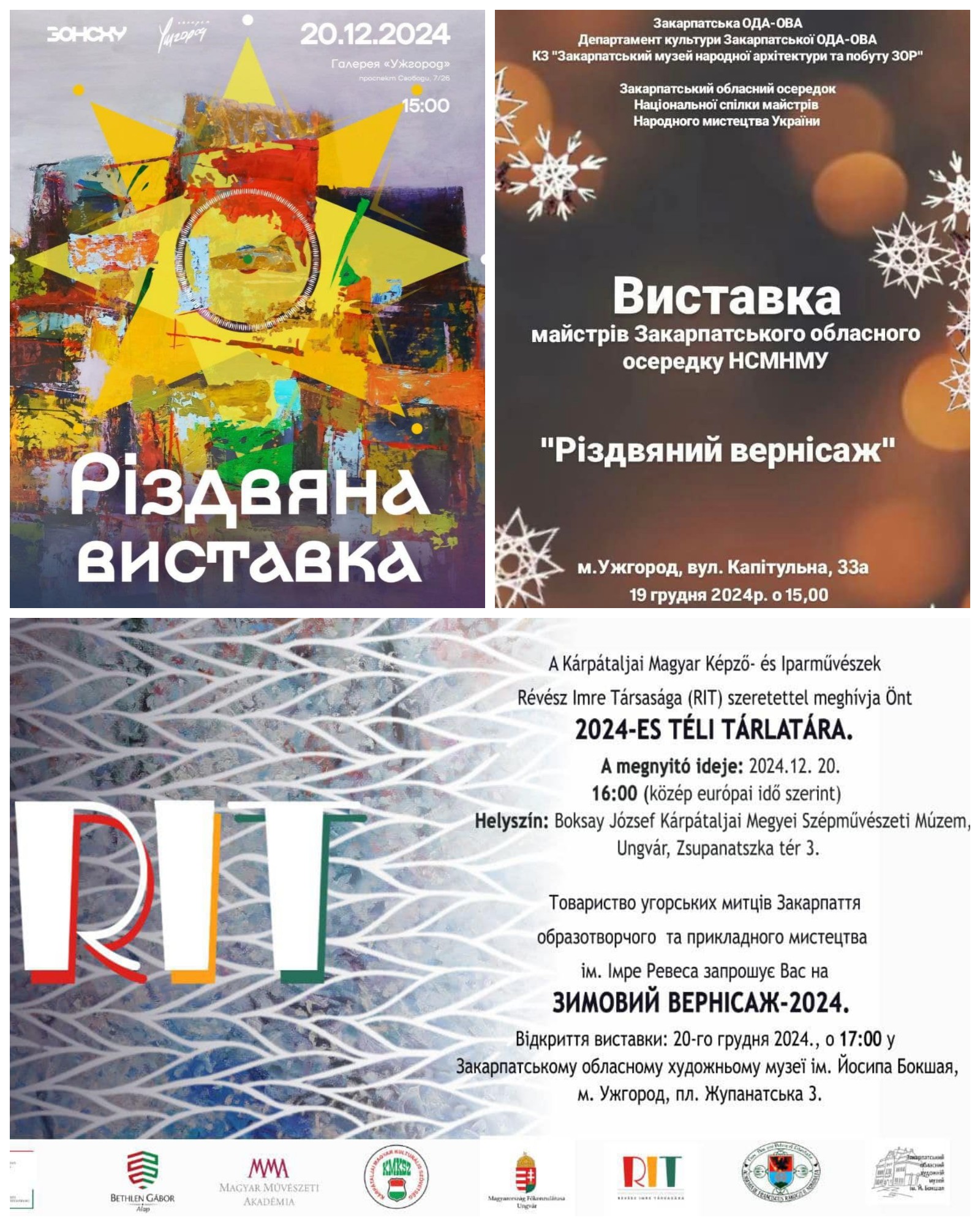 – о 17:00 – відкриття в залі Закарпатського обласного художнього музею ім.Й.Бокшая виставки «Зимовий вернісаж – 2024» із творів членів Товариства угорських митців Закарпаття ім.Імре Ревеса та церемонія нагородження цьогорічних лауреатів Премії ім.Імре Ревеса.
