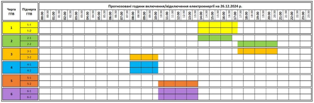 Довідка. Споживачі кожної області, які не належать до переліку об’єктів критичної інфраструктури, розділені на 6 черг (груп) та 12 підгруп. Застосування обмежень до трьох черг означає, що для половини споживачів у кожному регіоні діють графіки погодинних відключень. Чотири черги – обмеження до 70% споживачів у кожній області.