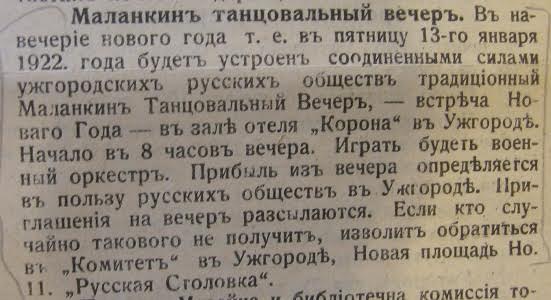 У газетах початку минулого століття писали, що в Ужгороді услід за Європою стало модним гучно відзначати Новий рік. Власне, це свято називали по-різному. Десь писали про Сильвестра (в європейських країнах часто Новий рік теж так називають, пов’язуючи свято із Днем св.Сильвестра 31 грудня), а в інших джерелах – про Маланку (31 грудня за старим стилем і 13 січня, переддень “старого Нового року” – за новим).
