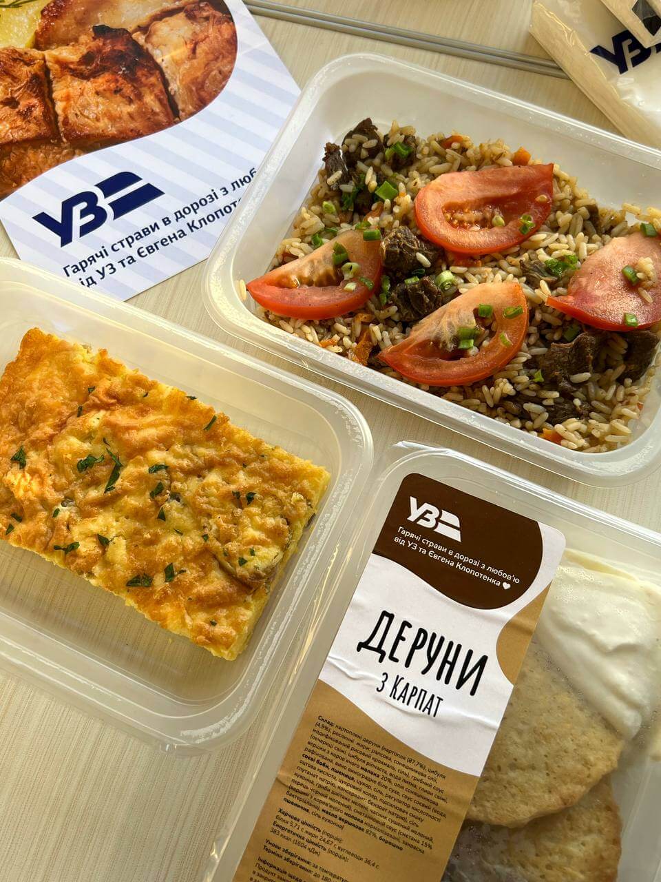 “Страви приготовлені та заморожені інноваційним способом, який забезпечує свіжість продуктів і дозволяє зберегти смак після розігрівання, — кажуть в Укрзалізниці. І додають: — Якщо ви виробник якісних сертифікованих продуктів харчування, готові інвестувати в обладнання та нагодувати українців смачними стравами на борту наших поїздів — напишіть нам на [email protected]”