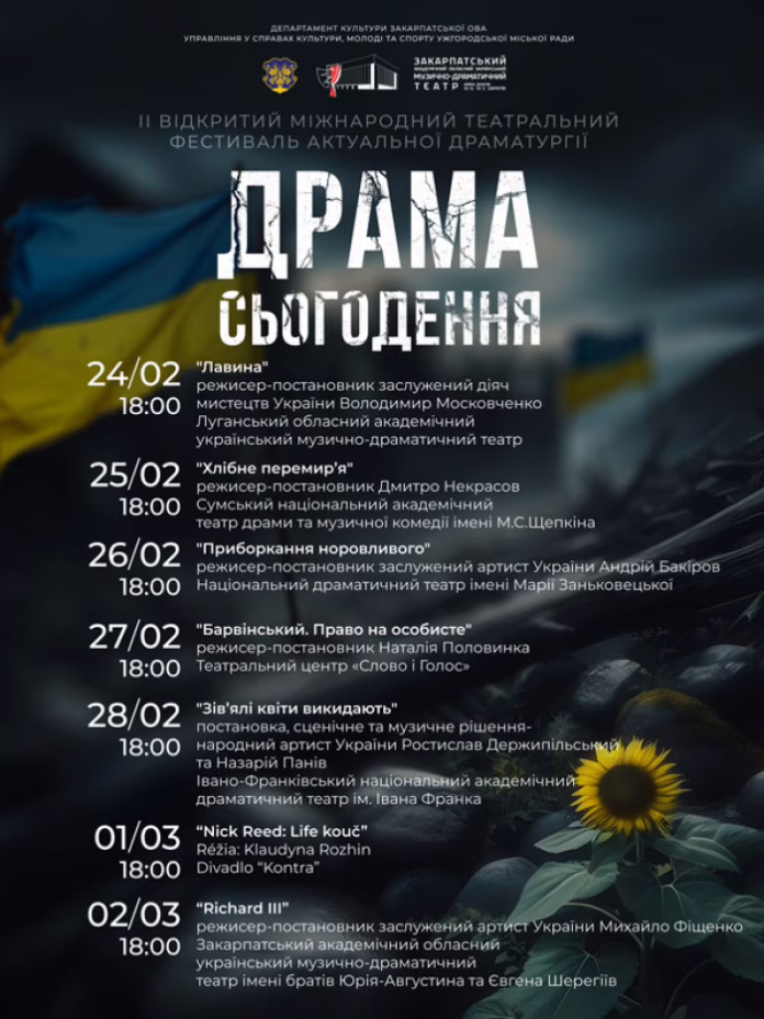 Директор-художній керівник театру Рудольф Дзуринець розповів, що торік, під час першого фестивалю, на головній театральній сцені Закарпаття вдалося зібрати провідні вітчизняні колективи, які представили своє бачення ситуації в Україні через призму театрального мистецтва. Цього ж разу до участі були запрошені і колективи кількох європейських країн, однак більшість зі зрозумілих причин відмовляються приїздити в Україну. Відтак, статус міжнародного своєю участю у фестивалі забезпечить театр зі Словаччини, виставу якого глядачі зможуть переглянути в суботу, 1 березня.