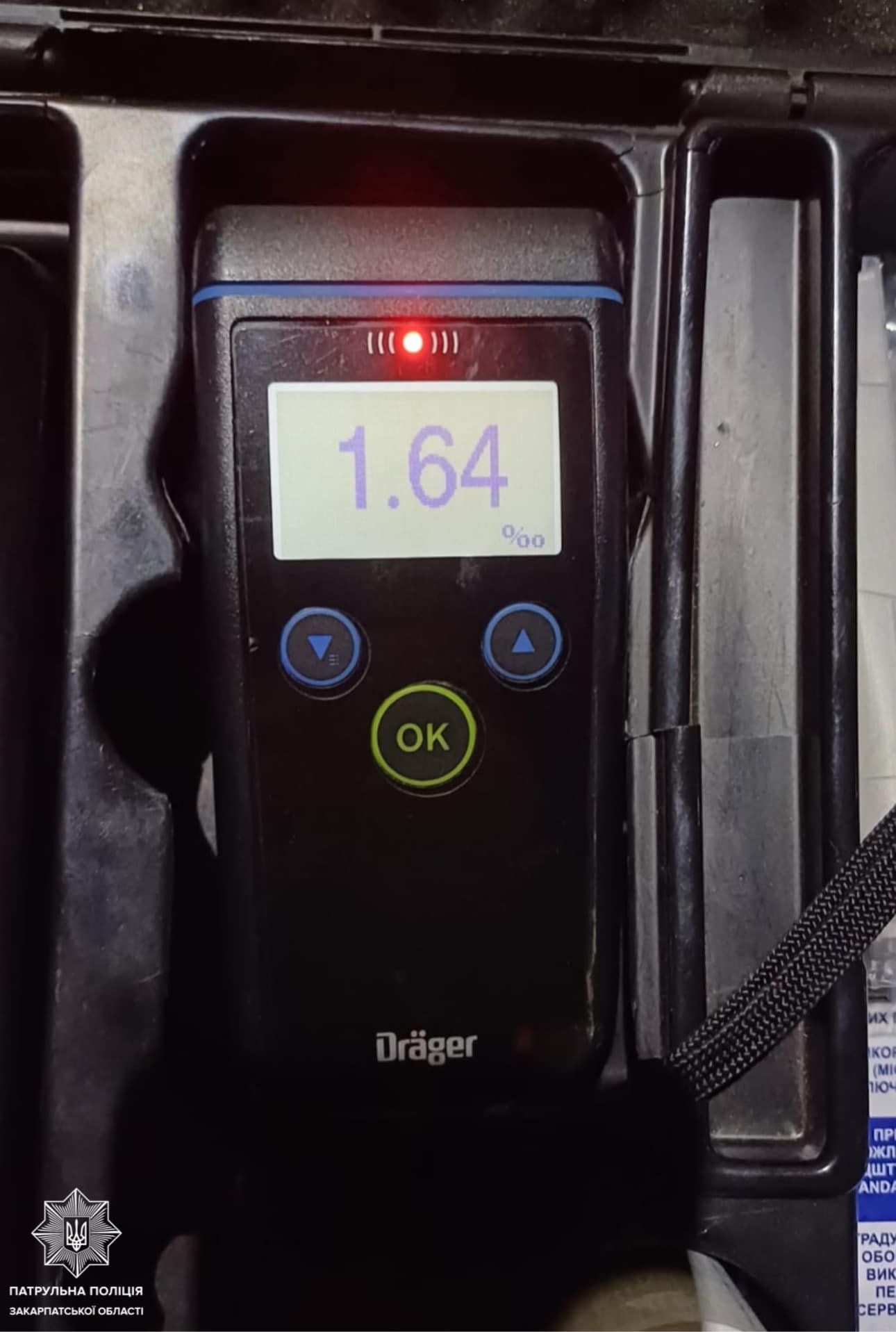 Під час спілкування з винуватцем ДТП патрульні помітили у нього ознаки алкогольного сп’яніння, на що йому одразу запропонували пройти огляд за допомогою Драгера. Результат виявися позитивним — 1.64 проміле, а це у понад 8 разів перевищує допустиму норму алкоголю в крові.