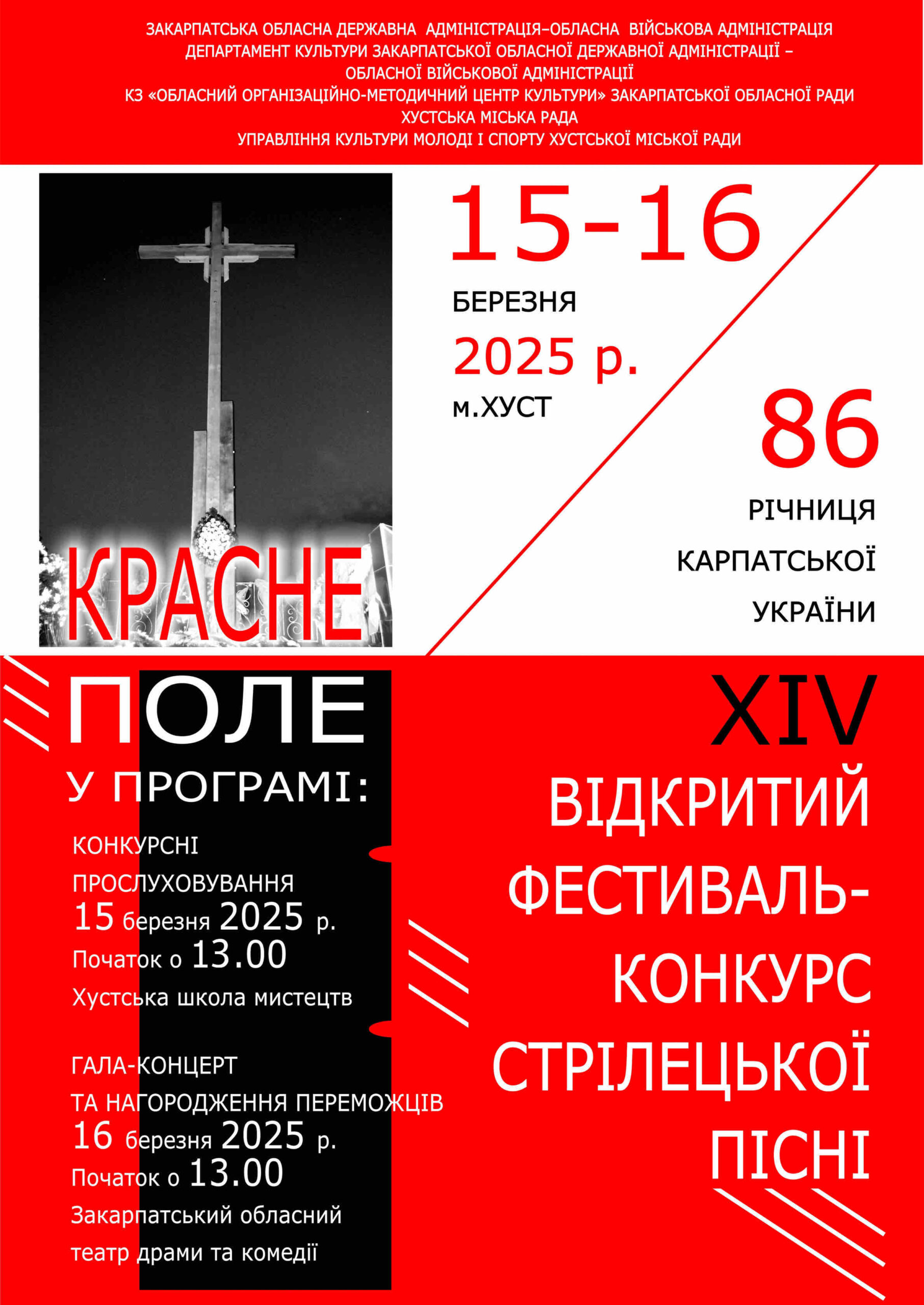 Засновники Відкритого фестивалю-конкурсу стрілецької пісні «Красне поле» – департамент культури Закарпатської обласної державної адміністрації–обласної військової адміністрації.