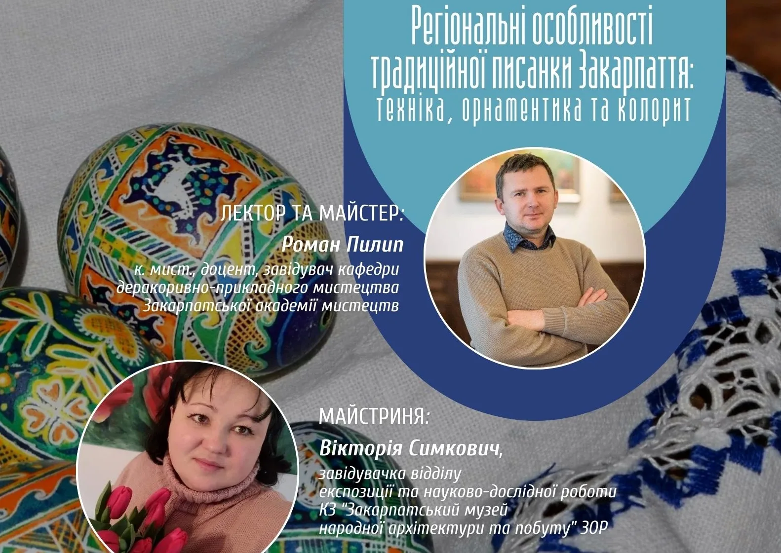 Під час лекції Роман Пилип, кандидат мистецтвознавства, доцент, завідувач кафедри декоративно-прикладного мистецтва Закарпатської академії мистецтв розповість про унікальні регіональні відмінності закарпатських писанок, їх символіку та історію.