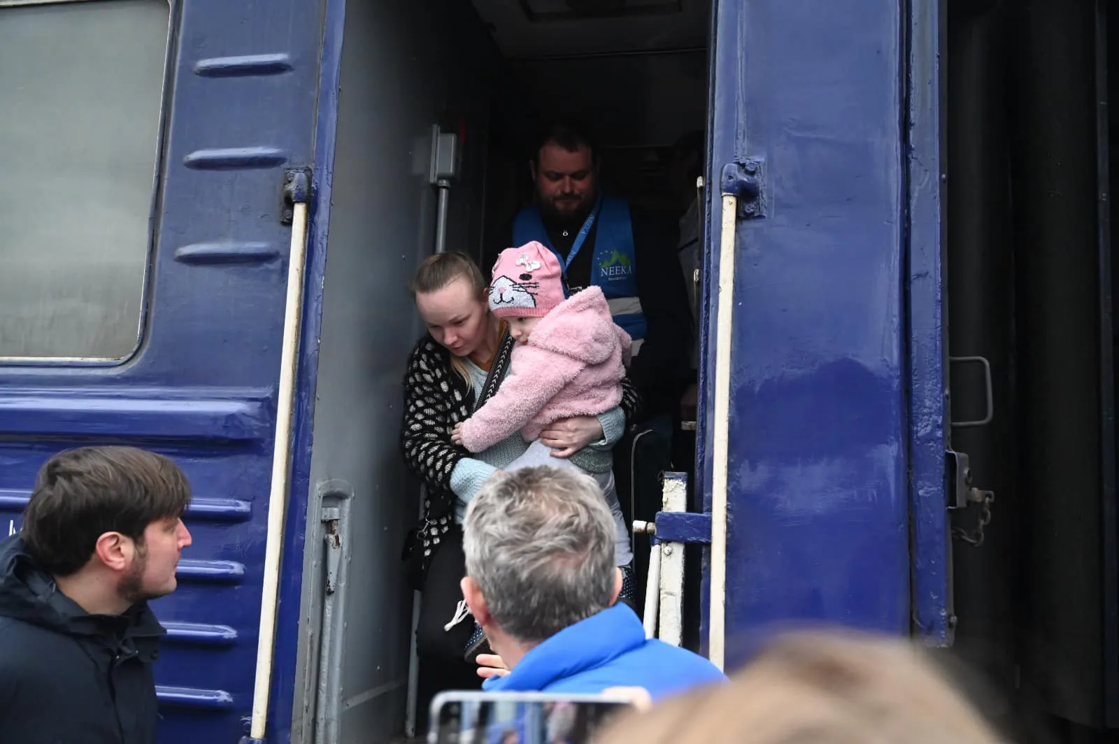 На залізничному вокзалі у Мукачеві вимушено переміщених українців зустрічали представники Закарпатської обладміністрації, психологи ДСНС, медики та волонтери громадської місії «Проліска», організацій Dorcas, NEEKA Ukraine, Червоного Хреста Закарпаття й інші.