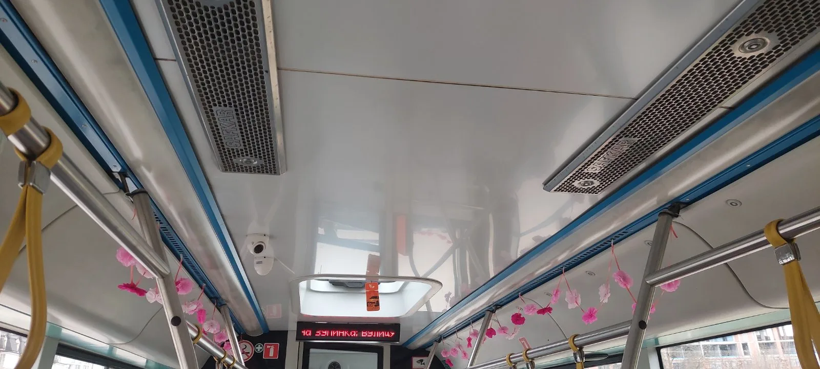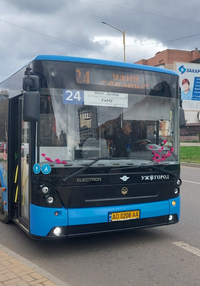 Рожевими квітками прикрасили салони автобусів, а штучні гілочки сакур розмістили за лобовим склом.
