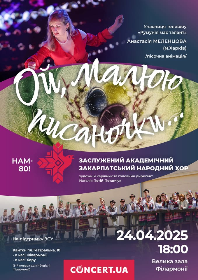 24 квітня о 18-й годині у Великій залі Закарпатської філармонії, відбудеться унікальний творчий проєкт Закарпатського народного хору та Анастасії Меленцової (м.Харків), яка творить з пісочною анімацією, це неймовірний живопис піском на світловому столі.