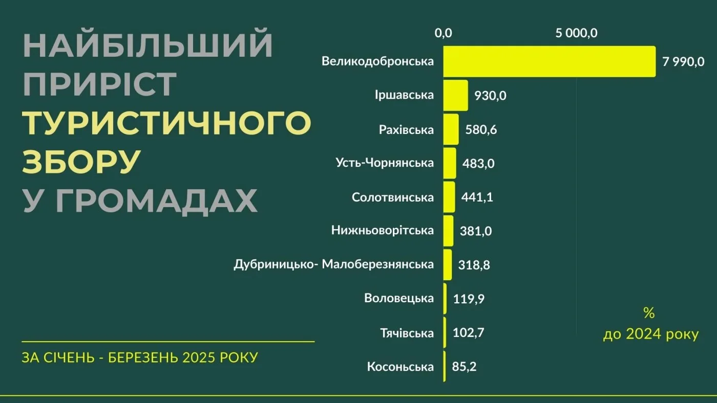 Протягом січня-березня 2025 року до місцевих бюджетів Закарпатської області сплачено 5 млн 489 тис. 300 грн туристичного збору, що на 34,8% відсотка більше аналогічного періоду 2024 року.