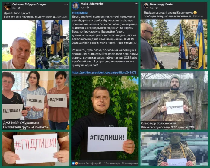 , волонтери, педагоги, підприємці, журналісти та небайдужі закарпатці розгорнули в соціальних мережах широку кампанію із гетеґом #ПІДПИШИ, щоб зібрати підписи для присвоєння почесного звання “Герой України” ужгородському вчителю Василю Габрусю, який поліг на війні з росією.