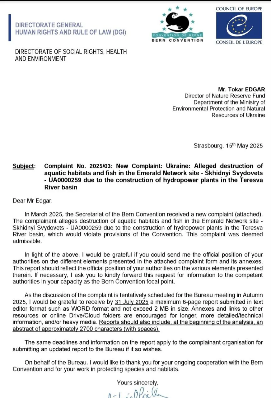 У зв’язку з цим Секретаріат Бернської конвенції звернувся до директора Департаменту природно-заповідного фонду та біорізноманіття Міністерства захисту довкілля та природних ресурсів України Едгара Токара для отримання офіційної позиції влади України щодо планованого будівництва каскаду МГЕС на «заповідній» річці Тересва в Тячівському районі.