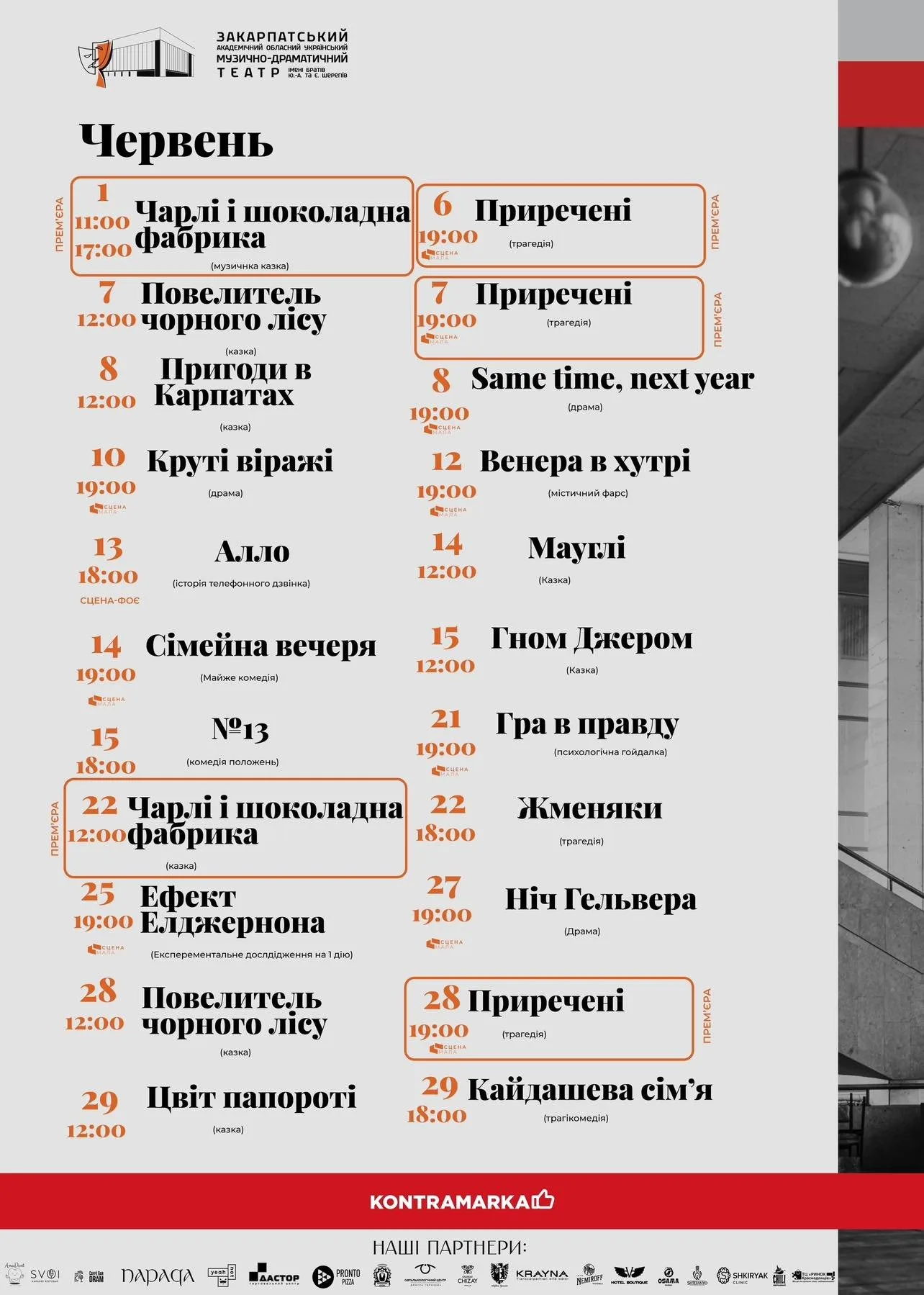 Закарпатський академічний музично-драматичний театр імені братів Шерегіїв у червні представить низку різножанрових вистав для дітей і дорослих. Уже 1 та 22 червня глядачі побачать «Чарлі і шоколадну фабрику» за Роальдом Далом у постановці Яни Богомолової. А 6, 7 і 28 червня на малій сцені покажуть трагедію «Приречені» за п’єсою Олега Михайлова, поставлену запрошеним режисером Артуром Опрятним із Дніпра.