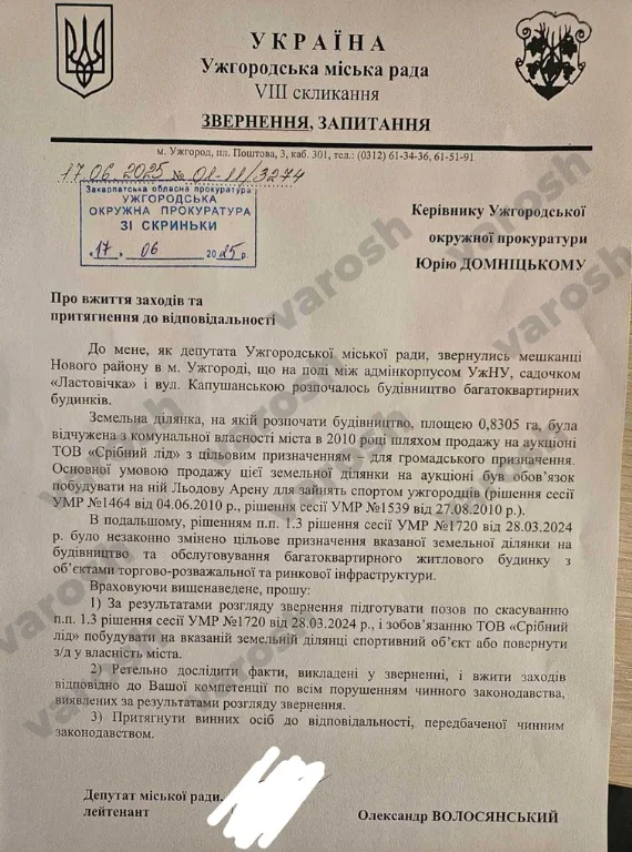 «Земельна ділянка, на якій розпочати будівництво була відчужена з комунальної власності міста у 2010 році шляхом продажу на аукціоні ТОВ «Срібний лід» з цільовим призначенням – для громадського призначення. Основною умовою продажу цієї земельної ділянки на аукціоні був обов’язок побудувати на ній Льодову Арену для занять спортом ужгородців. В подальшому, рішенням п.п. 1.3 рішення сесії УМР №1720 від 28.03.2024 р. було незаконно змінено цільове призначення вказаної земельної ділянки на будівництво та обслуговування багатоквартирного житлового будинку з об’єктами торгово-розважальної та ринкової інфраструктури», — йдеться у заяві.