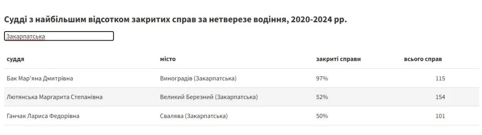 Так, суддя Виноградівського районного суду Мар’яна Бак впродовж 2020-2024 років розглянула 115 справ, що стосувалися нетверезого водіння. З них 97% справ за рішенням судді були закриті.