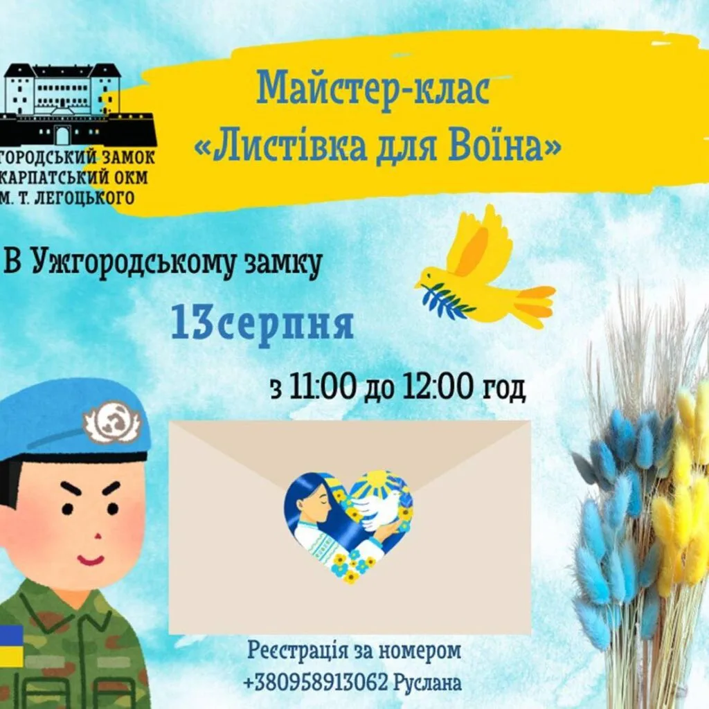 13 серпня з 11:00 до 12:00 в Ужгородському замку, у Краєзнавчому музеї імені Тиводара Легоцького, відбудеться майстер-клас “Листівка для воїна”.
