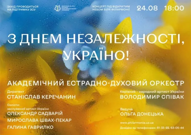 Перед обласною філармонією, на площі Фенцика пройде благодійний концерт просто неба «З Днем Незалежності, Україно!» у виконанні Академічного естрадно-духового оркестру (керівник – народний артист України Володимир Співак, диригент – Станіслав Керечанин) та солістів – заслуженого артиста України Олександра Садварія, Мирослави Швах-Пекар і Галини Гаврилко.