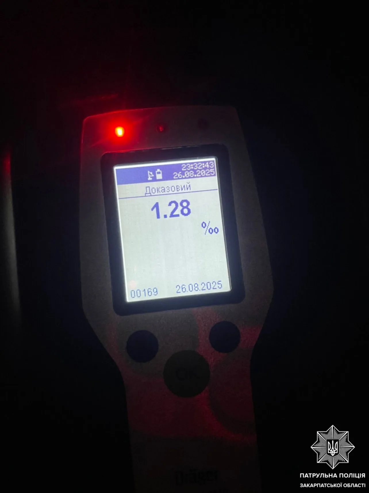 Під час перевірки документів поліцейські виявили у водія явні ознаки алкогольного сп’яніння. Чоловік погодився пройти тест на місці, який підтвердив наявність алкоголю в крові — 1,28 проміле.