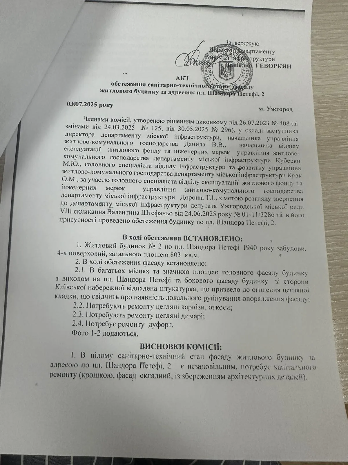 — У червні цього року депутат Валентин Штефаньо написав звернення з проханням провести обстеження будинку, пояснила вона. — Ми створили комісію, обстежили будівлю: крім того, що на фасаді відпадає штукатурка, ремонту потребують димарі, карнизи, дуфорт. Стан будинку незадовільний, будівля потребує капітального ремонту зі збереженням архітектурних деталей.
