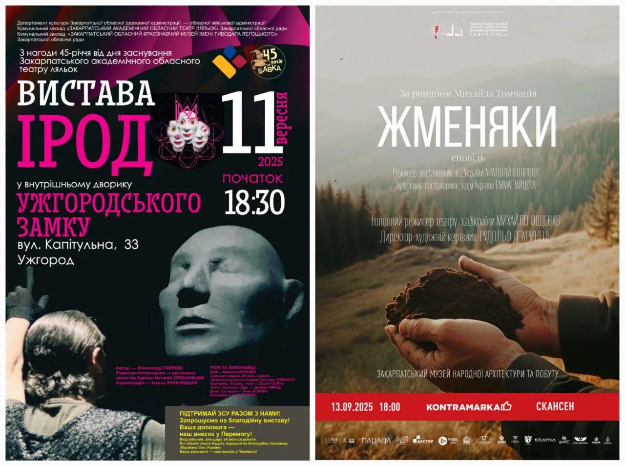 У суботу, 13 вересня, театральне дійство продовжиться у Закарпатському музеї народної архітектури та побуту (Ужгородський Скансен). Тут Закарпатський академічний музично-драматичний театр імені братів Шерегіїв представить виставу «Жменяки» за мотивами однойменного роману Михайла Томчанія, класика української літератури.