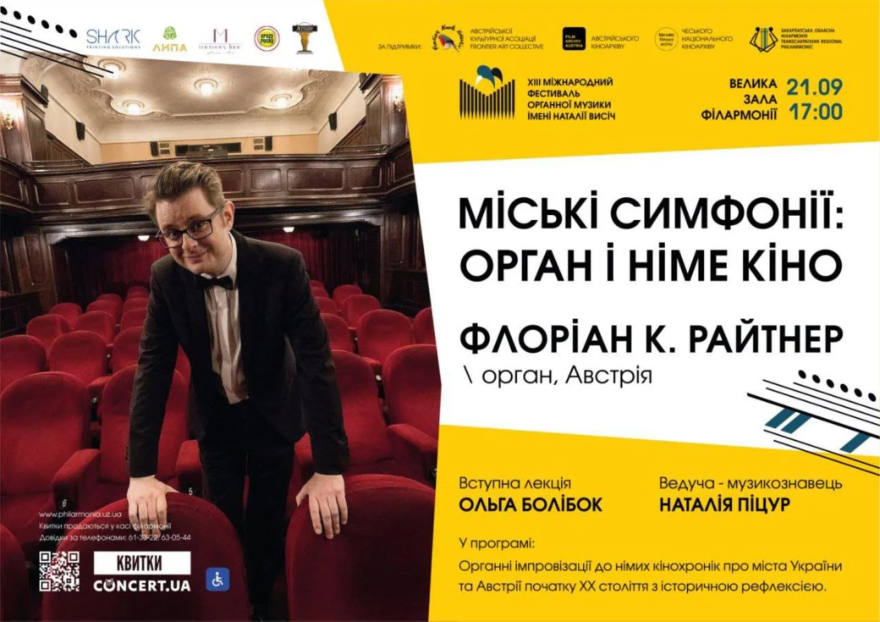 Вже сьогодні, 21 вересня, на сцені філармонії виступить особливий гість з Австрії — піаніст, композитор та імпровізатор Флоріан Райтнер. Він презентує програму «Міські симфонії» — незвичний вечір німого кіно з живим супроводом на органі. Музикант відомий своєю роботою у віденському кінотеатрі METRO, де озвучує класичне німе кіно, та участю в міжнародних кінофестивалях.