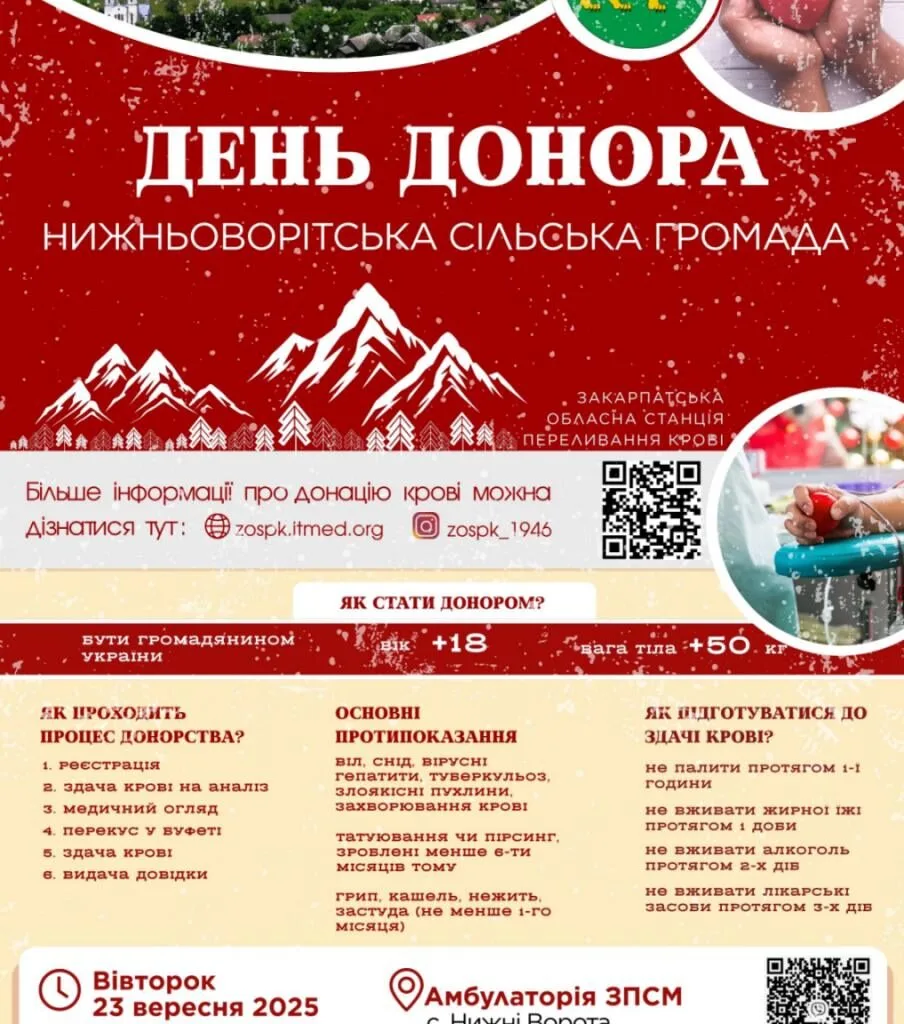 23 вересня у селі Нижні Ворота відбудеться виїзний забір крові, завдяки якому стати донором можна буде, не відвідуючи центр крові.