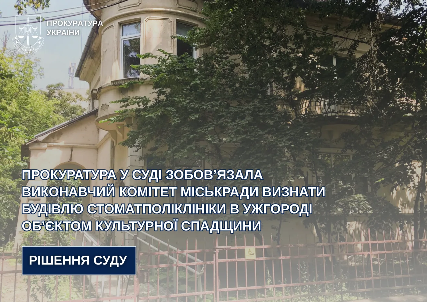 За доводами прокурорів Ужгородської окружної та Закарпатської обласної прокуратур у судах першої та апеляційної інстанцій розпочато процедуру набуття статусу як щойно виявленого об’єкту культурної спадщини для будівлі Закарпатської обласної стоматологічної поліклініки.