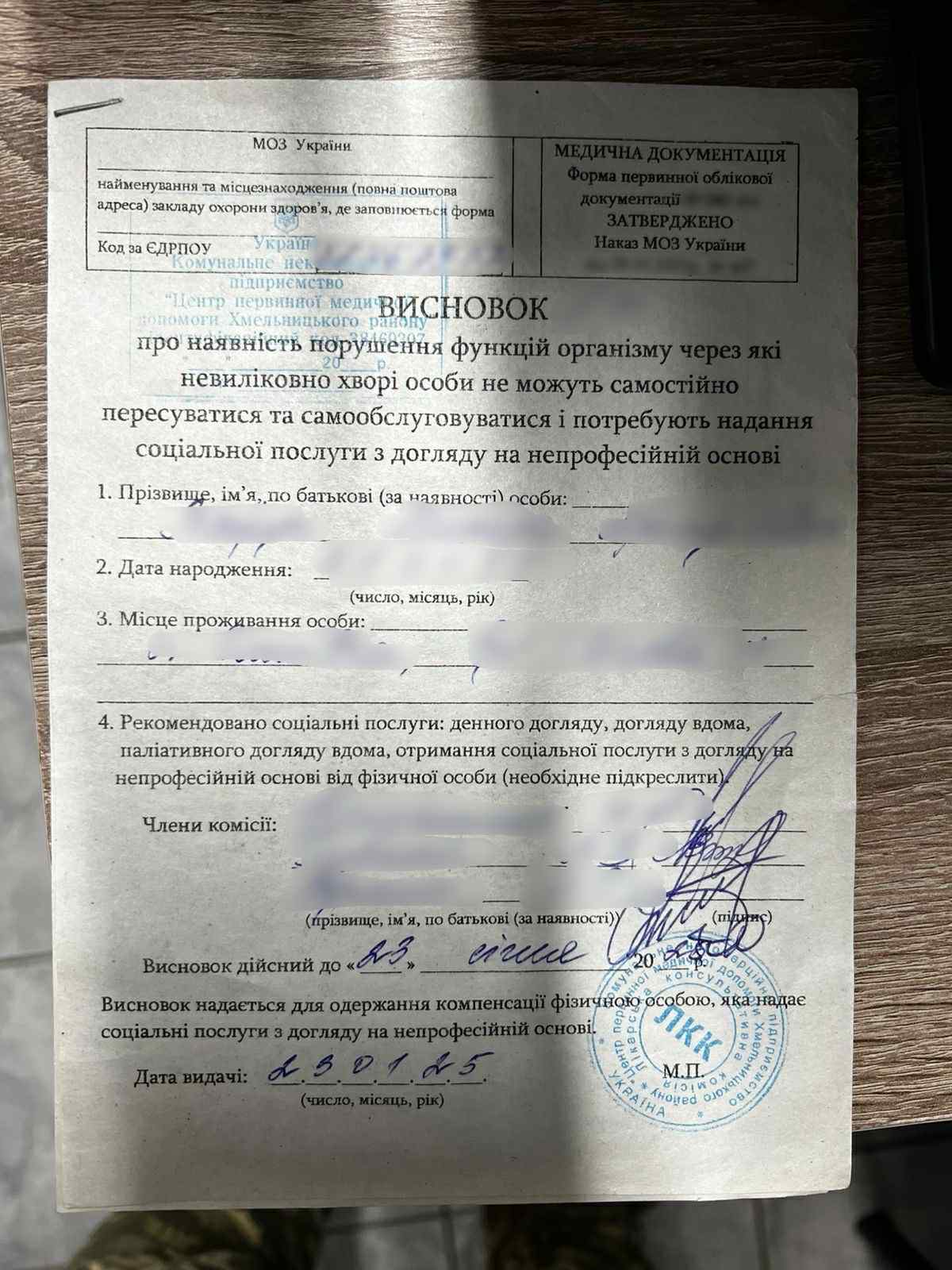 Інший випадок — 46-річний чоловік із Хмельниччини. Він також намагався скористатися фіктивним медичним висновком, у якому йшлося про неможливість його батька пересуватися самостійно.