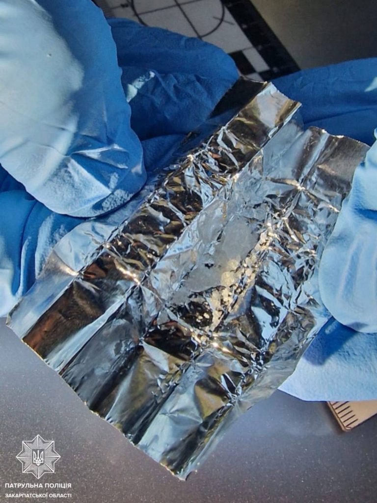 Згодом у сумці воді патрульні виявили зіп-пакет із подрібненою зеленою речовиною, зовні схожою на наркотичну. А в гаманці — складену фольгу з білою кристалічною речовиною, схожою на метамфетамін.