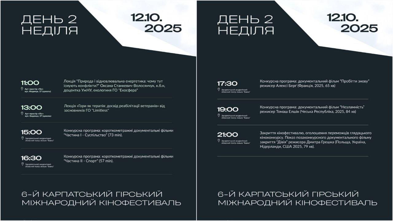 У програмі — українські та міжнародні фільми, конкурсні покази короткометражок з усього світу, документальні стрічки про довкілля та гори, а також зустрічі з альпіністами, лекції та обговорення.