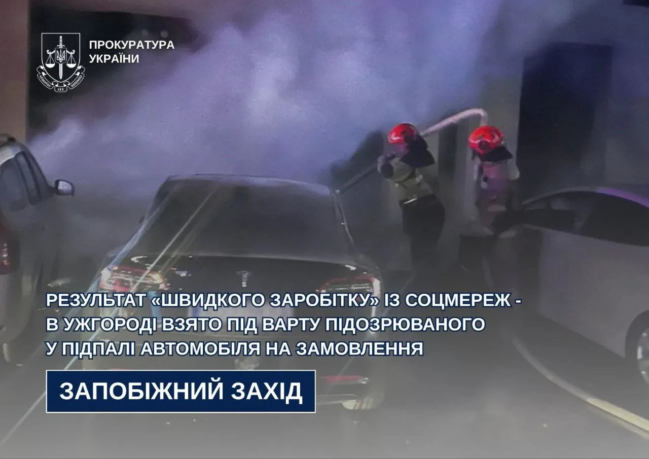 За доводами керівника Ужгородської окружної прокуратури слідчим суддею обрано запобіжний захід у вигляді тримання під вартою терміном на 60 діб підозрюваному у підпалі автомобіля Tesla. Окрім цього, йому визначено альтернативний запобіжний захід у вигляді застави у розмірі вартості автівки – майже 727 тис грн.