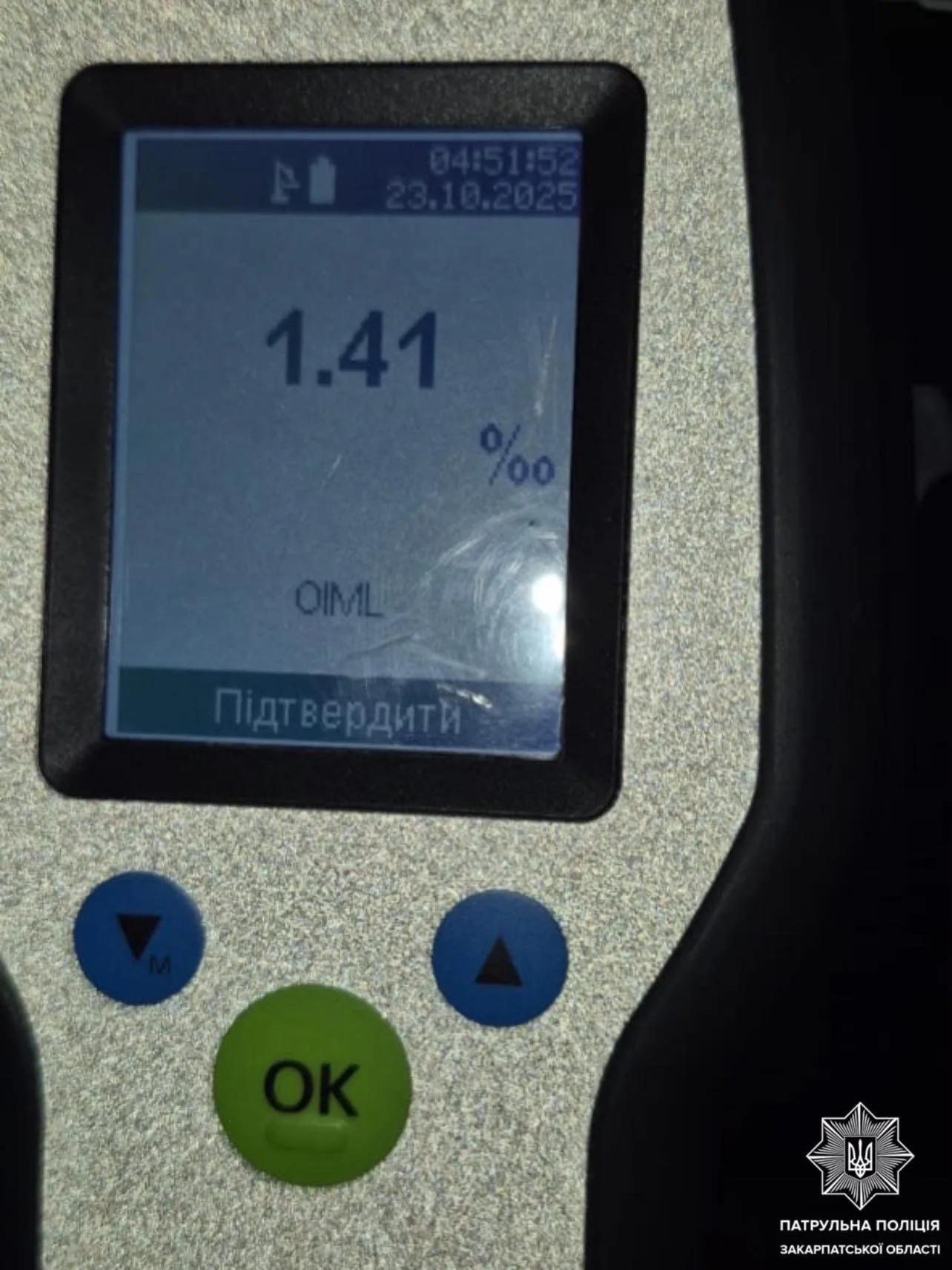 Огляд зі згоди кермувальника провели на місці зупинки за допомогою Драгера. Результат — 1,41‰ алкоголю в крові, з висновком громадянин погодився.