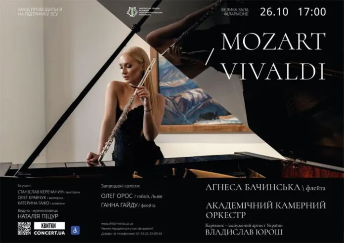 На сцені — флейтистка Агнеса Бачинська та Академічний камерний оркестр Закарпатської обласної філармонії під керівництвом заслуженого артиста України Владислава Юроша.