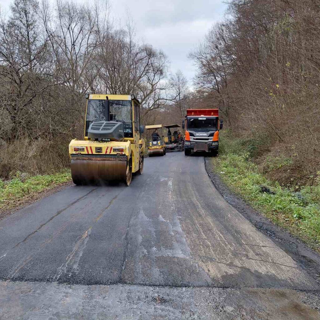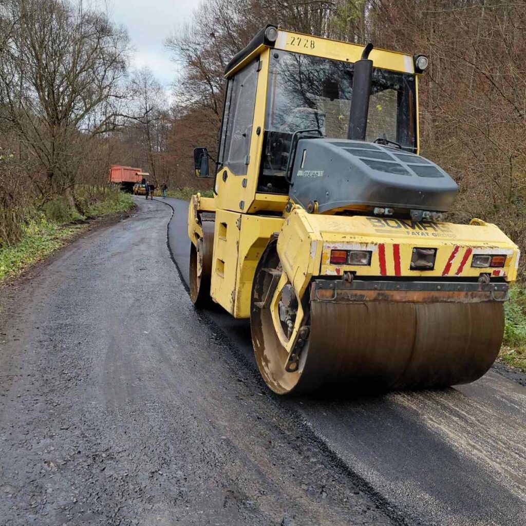 Роботи включають профілювання основи, укладання асфальтобетонного покриття та ущільнення катками.