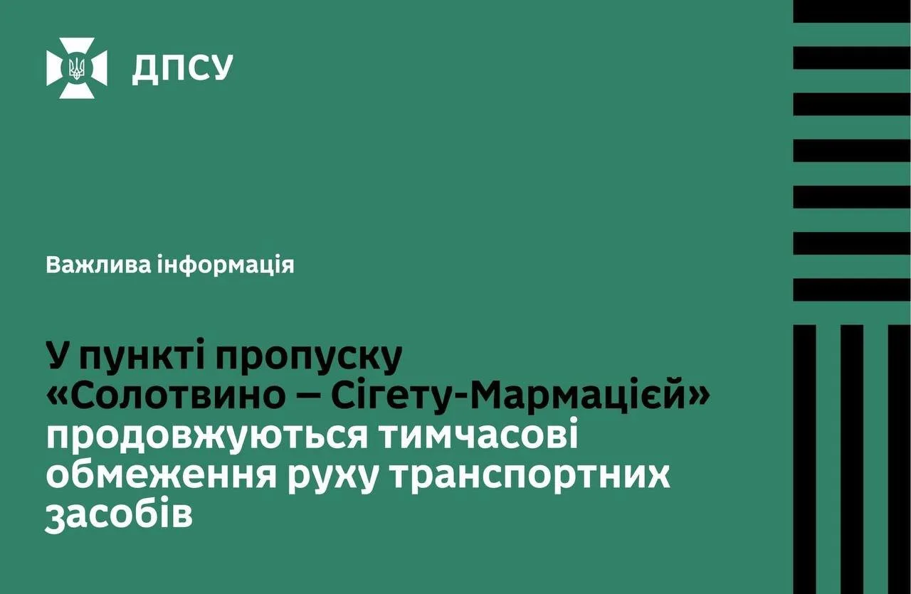 Повідомляється, що з 2 грудня 2025 року продовжуються тимчасові обмеження руху транспортних засобів через пункт пропуску «Солотвино – Сігету-Мармацієй».