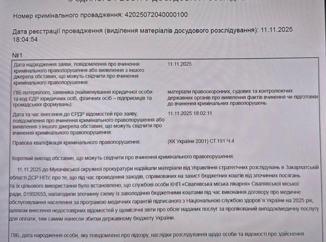 Ще одне кримінальне провадження стосується ймовірного свідомого завищення показників медичних послуг, які лікарня подавала до системи НСЗУ для отримання додаткового фінансування.