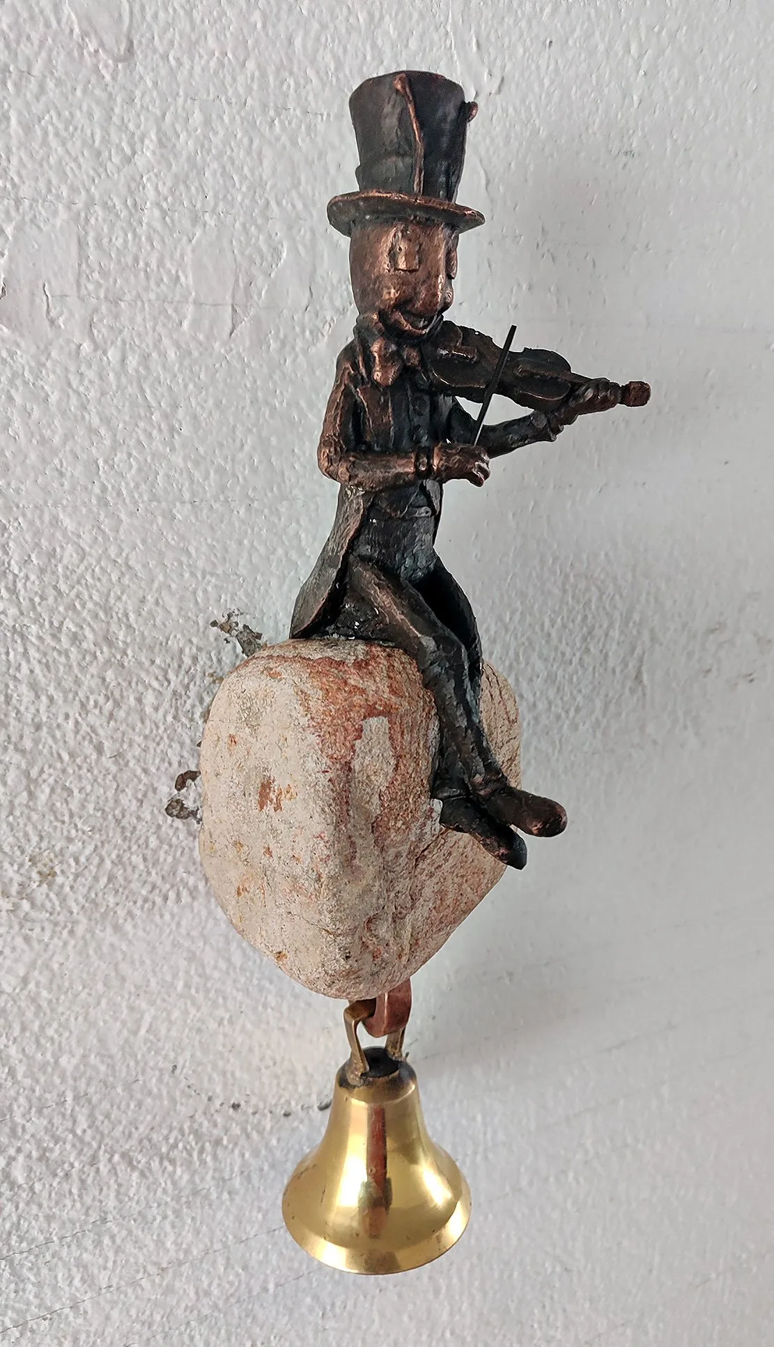 Сьогодні в Ужгороді відкрили чергову мініскульптуру на честь «Різдвяного цвіркуна». Цвіркун у циліндрі, що грає на скрипці, сидить на камені, під яким розташований дзвіночок.