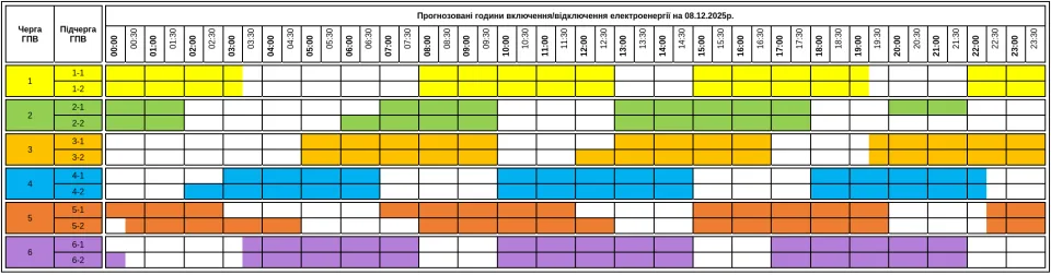 Графік відключень на 8 грудня оприлюднило “Закарпаттяобленерго”. Графік застосований для всіх 6 черг.