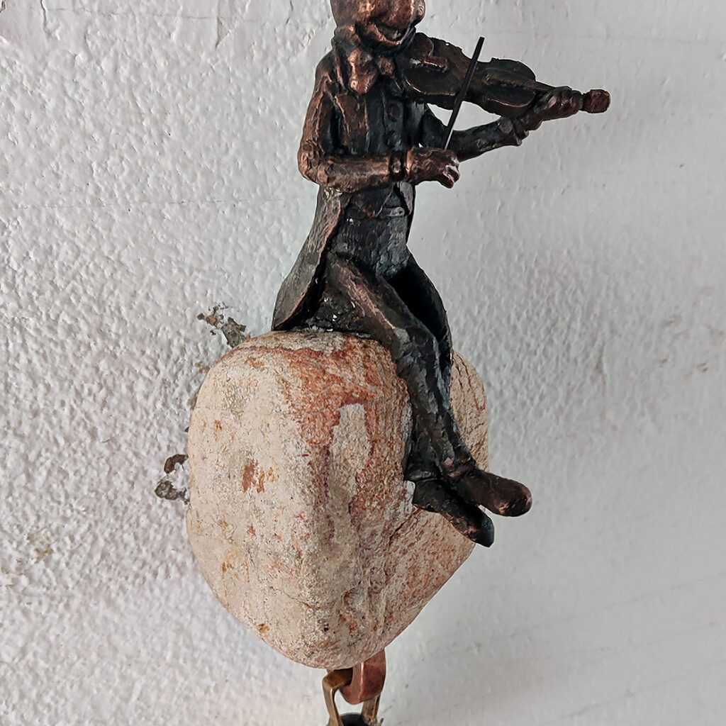 Автором мініскульптури став ужгородський скульптор Роман Мурник. Бронзовий цвіркун у циліндрі грає на скрипці, сидячи на камені, під яким розміщено дзвіночок. Праворуч можна побачити нотний ряд відомої різдвяної мелодії.