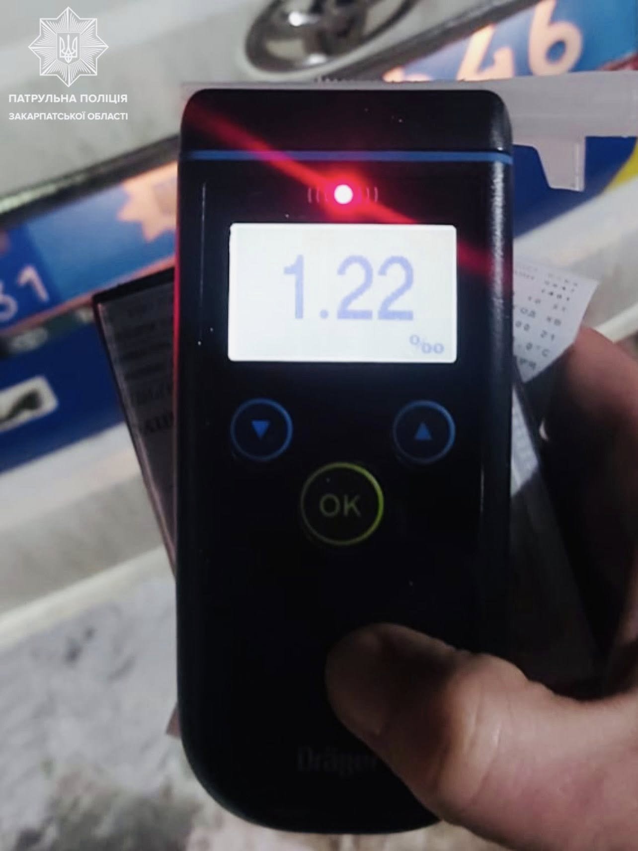 Під час спілкування з водієм інспектори помітили явні ознаки алкогольного сп’яніння — різкий запах алкоголю та порушення мови. Огляд на стан сп’яніння керманич пройшов безпосередньо на місці зупинки. Результат перевірки склав 1,22 проміле.
