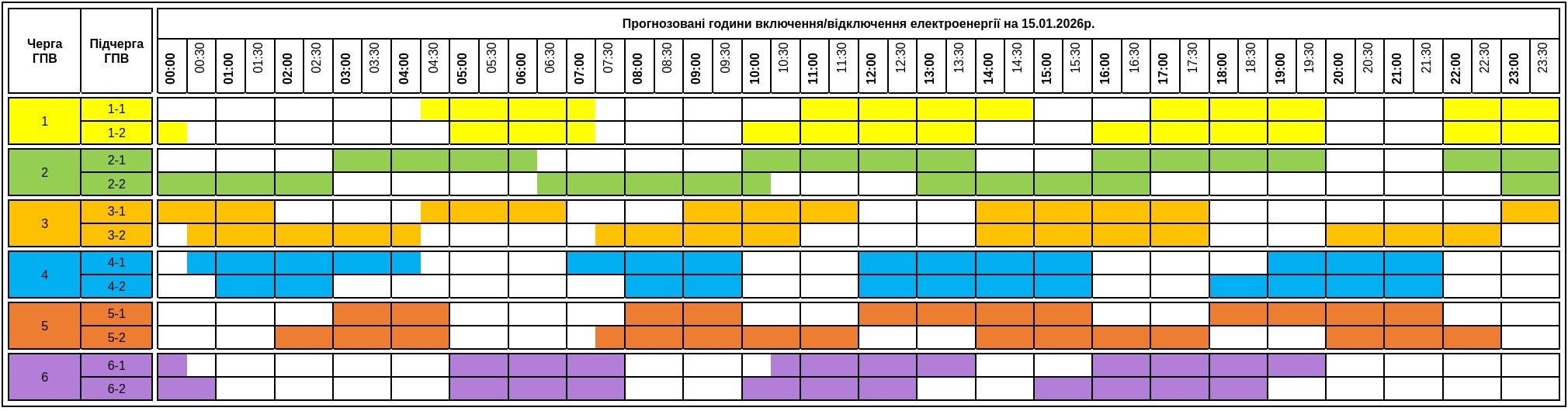 Згідно з актуальними даними, дефіцит потужності в загальнонаціональній мережі змушує енергетиків задіювати графіки погодинних відключень (ГПВ) упродовж усієї доби. Часові інтервали обмежень розподілені за шістьма основними чергами. Тривалість відсутності напруги безпосередньо залежить від поточного рівня споживання та стану енергетичного обладнання після попередніх ремонтних робіт.