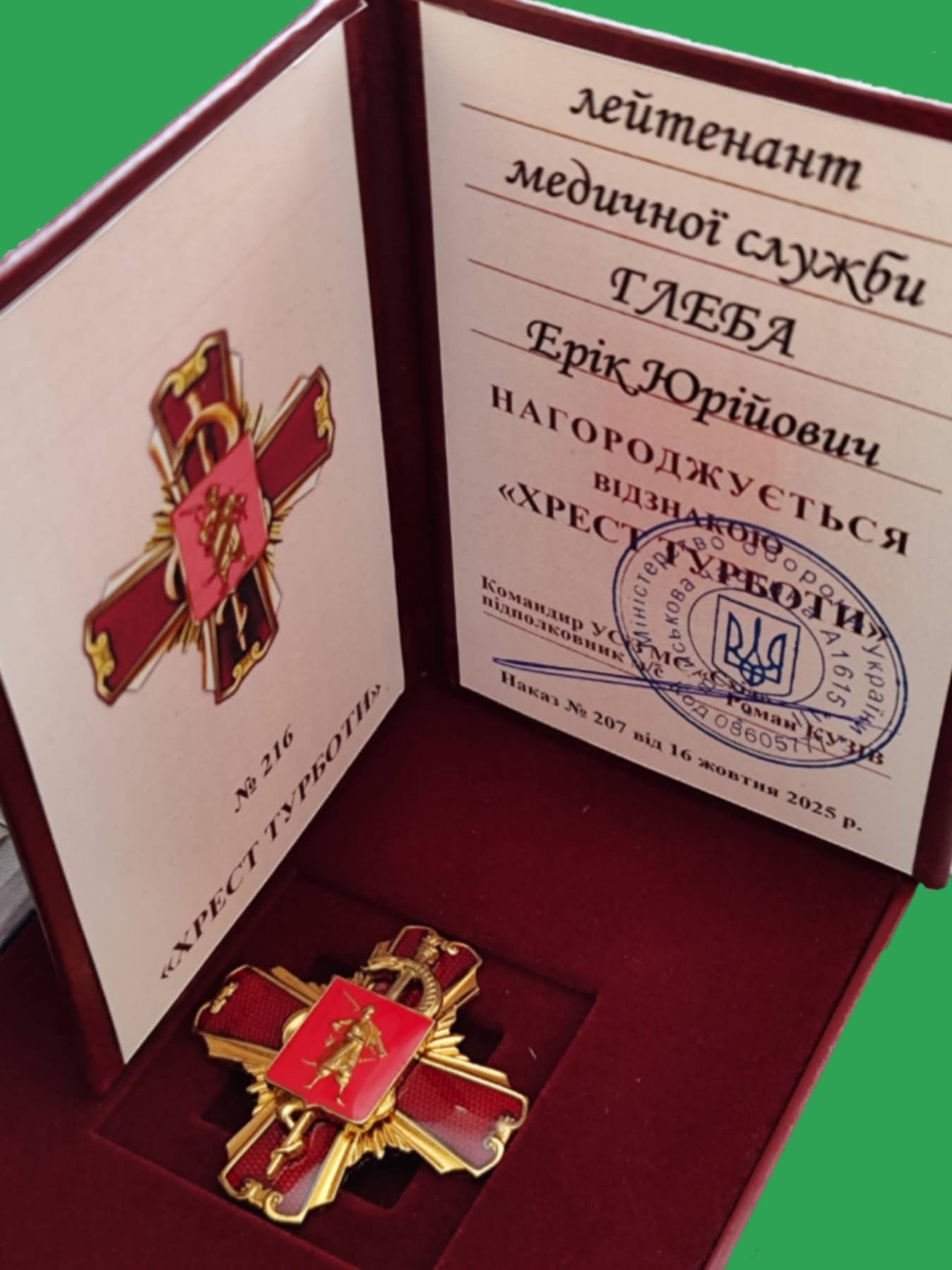 Ерік Глеба висловив свою вдячність за нагороду «Хрест Турботи», підкресливши, що ця нагорода для нього є символом щоденної боротьби за життя тих, хто стоїть на захисті України.