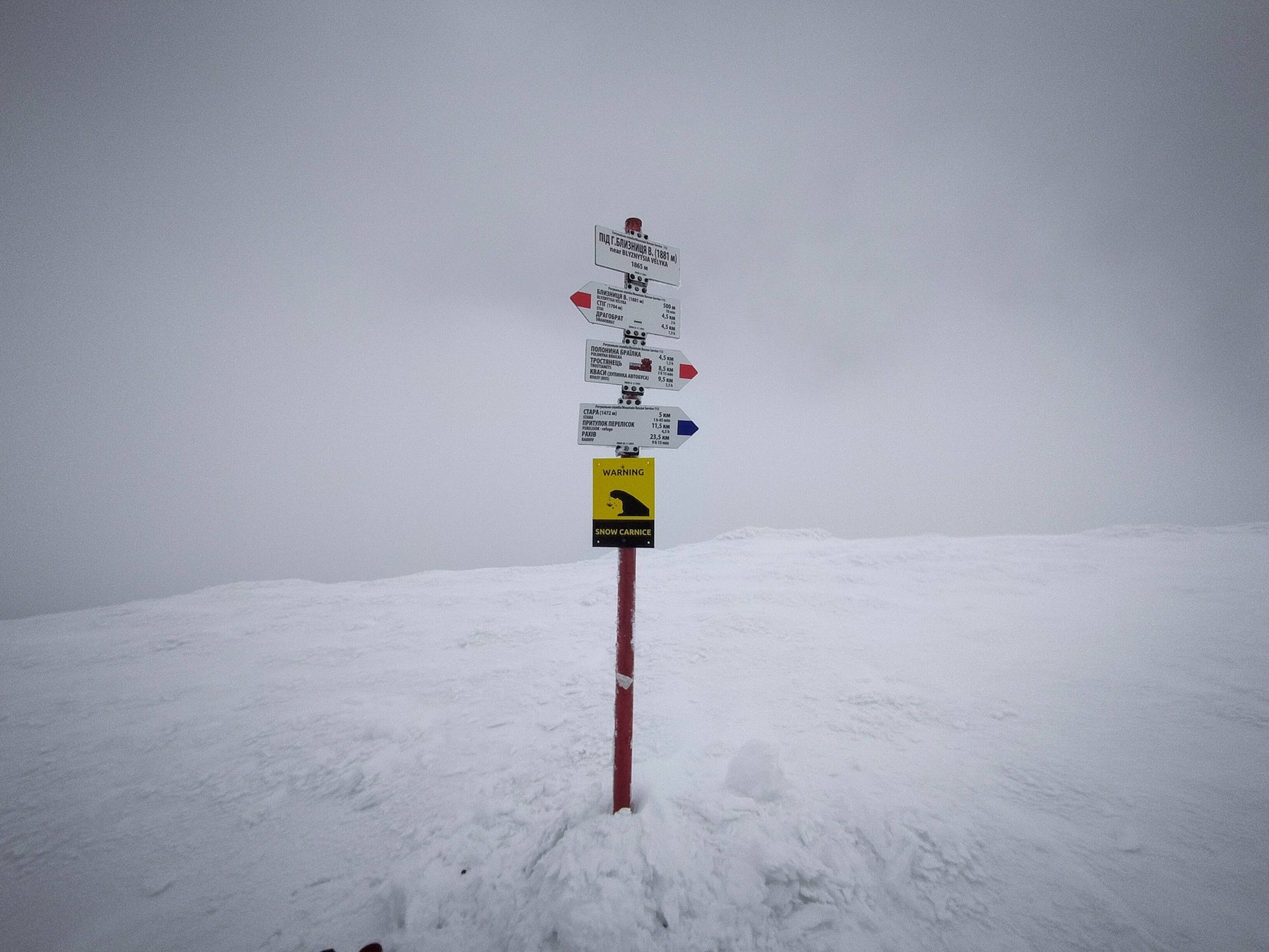 На високогірних маршрутах хребтя Свидовець рятувальники встановили попереджувальні знаки, якіเตструють турістів про небезпеку снігових карнизів.