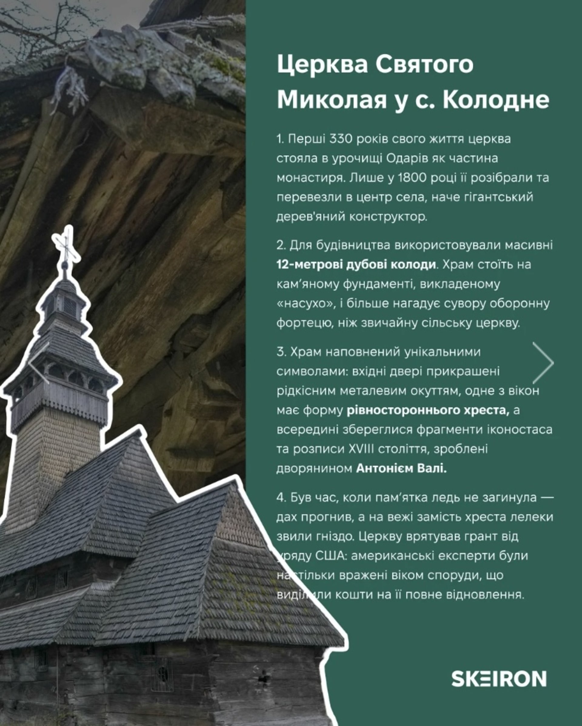 Однією з найстаріших пам’яток, що підлягає оцифруванню, є Церква святого Миколая, розташована у селі Колодне. Цей величний храм датується 1470 роком. Він був перевезений до села з урочища Одарів, де у минулому функціонував монастир. Будівля зведена з масивних 12-метрових дубових колод, які міцно стоять на кам’яному фундаменті. Особливістю цієї церкви є її старовинні двері, оздоблені рідкісним металевим окуттям, а також унікальне вікно, що вирізане у формі хреста. Всередині храму до наших днів збереглися оригінальний іконостас та фрески XVIII століття, які свідчать про високий рівень майстерності того часу.