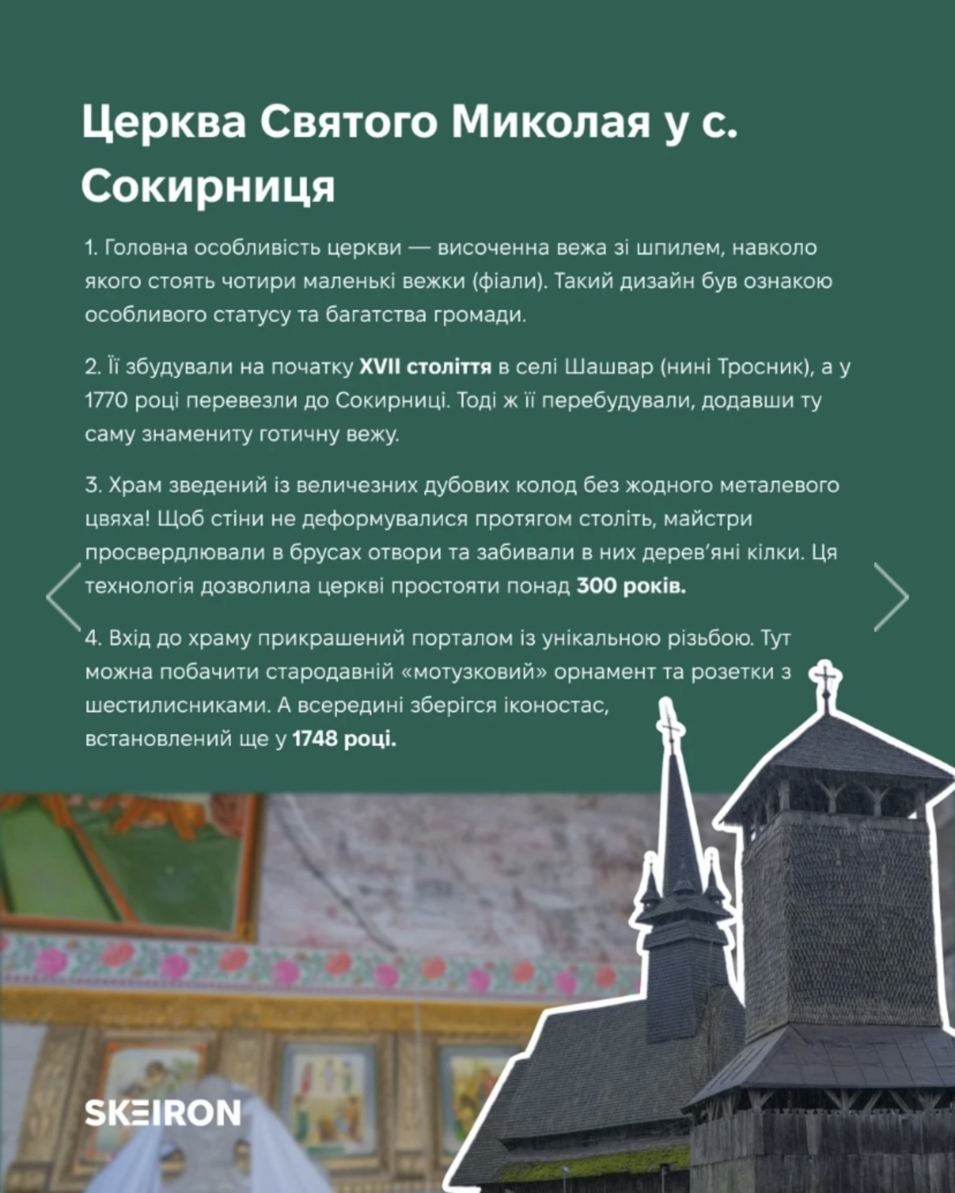 Також серед об’єктів дослідження виділяється Миколаївська церква, що знаходиться у селі Сокирниця. Цей дерев’яний храм XVII століття вражає своєю готичною вежею з високим шпилем, що прагне до неба. Його конструкція виконана з міцних дубових колод, а вхідний портал прикрашає старовинна різьба. Особливістю декору є «мотузковий» орнамент та різьблені розетки-шестилистники, що додають споруді особливої витонченості.