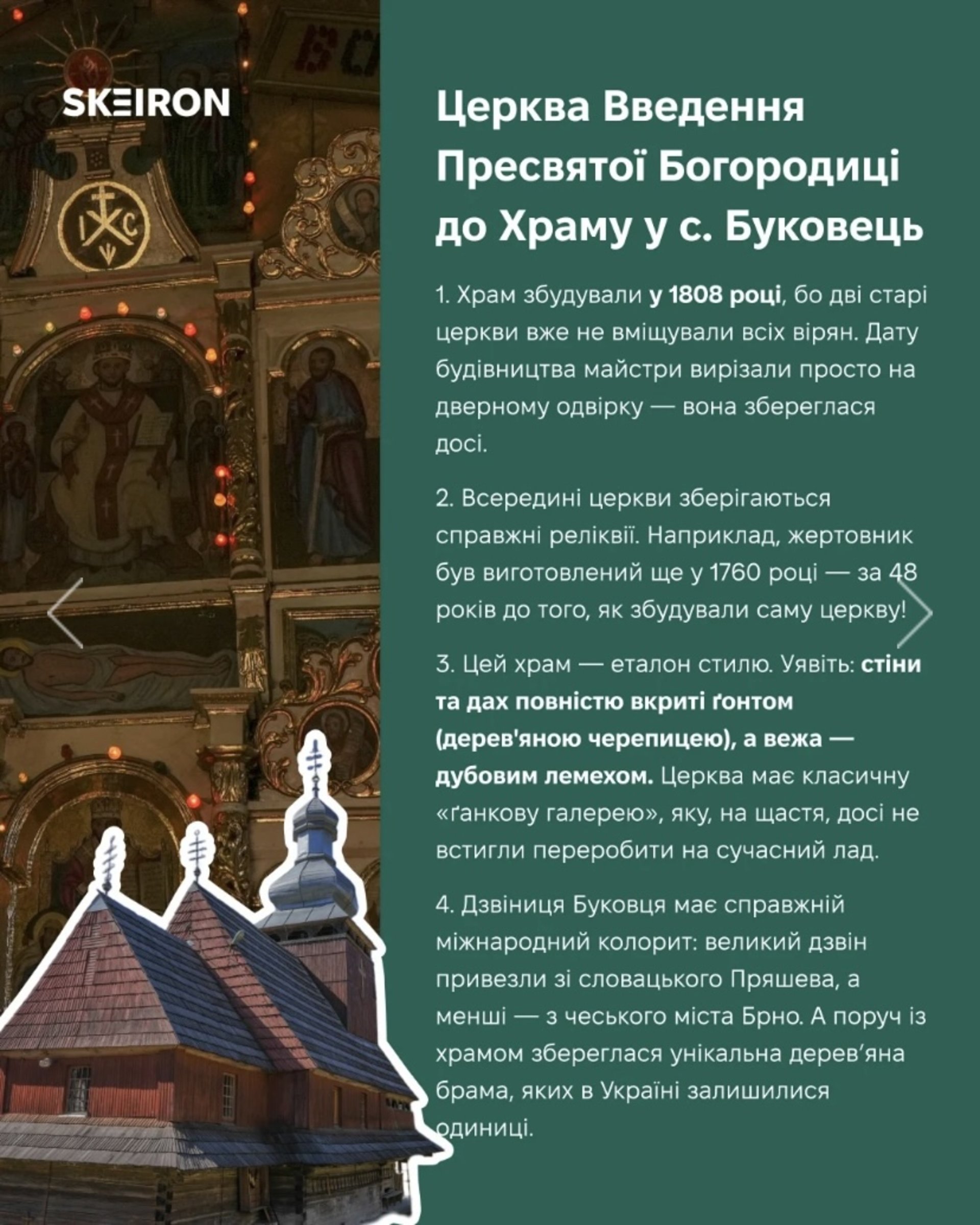 Серед інших цінних об’єктів, для яких планується створення 3D-моделі, варто відзначити Церкву Введення в храм Пресвятої Богородиці із села Буковець. Цей храм XIX століття вирізняється тим, що його стіни та дах повністю оббиті ґонтом, а також має елегантну ґанкову галерею. Ще одна церква з такою ж назвою — Церква Введення в храм Пресвятої Богородиці у селі Розтоки — також була перевезена зі свого первісного місця. Всередині цього храму збереглася унікальна сцена Страшного суду, де талановитий художник зобразив соціальні пороки свого часу, представивши корумпованих суддів, митників та п’яниць.