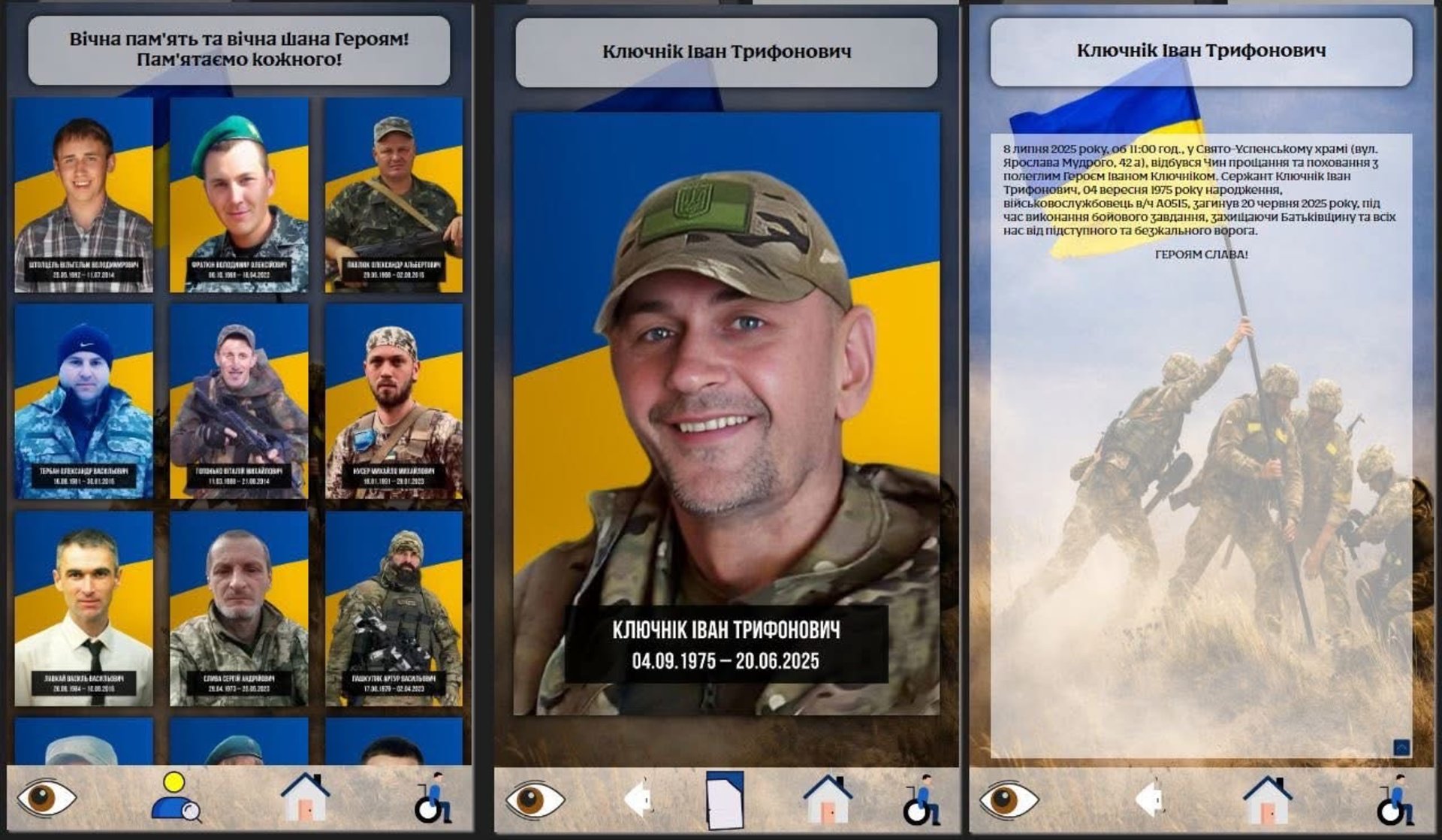 «Меморіал пам’яті» складається з п’яти розділів, серед яких «Галерея Слави», де представлені світлини та інформація про кожного загиблого захисника.